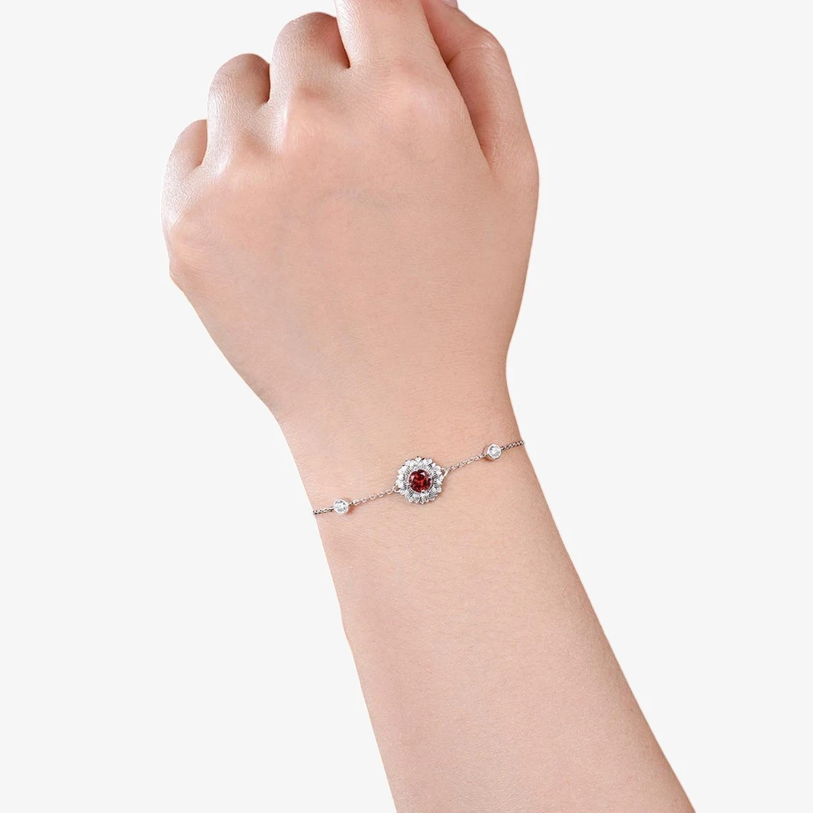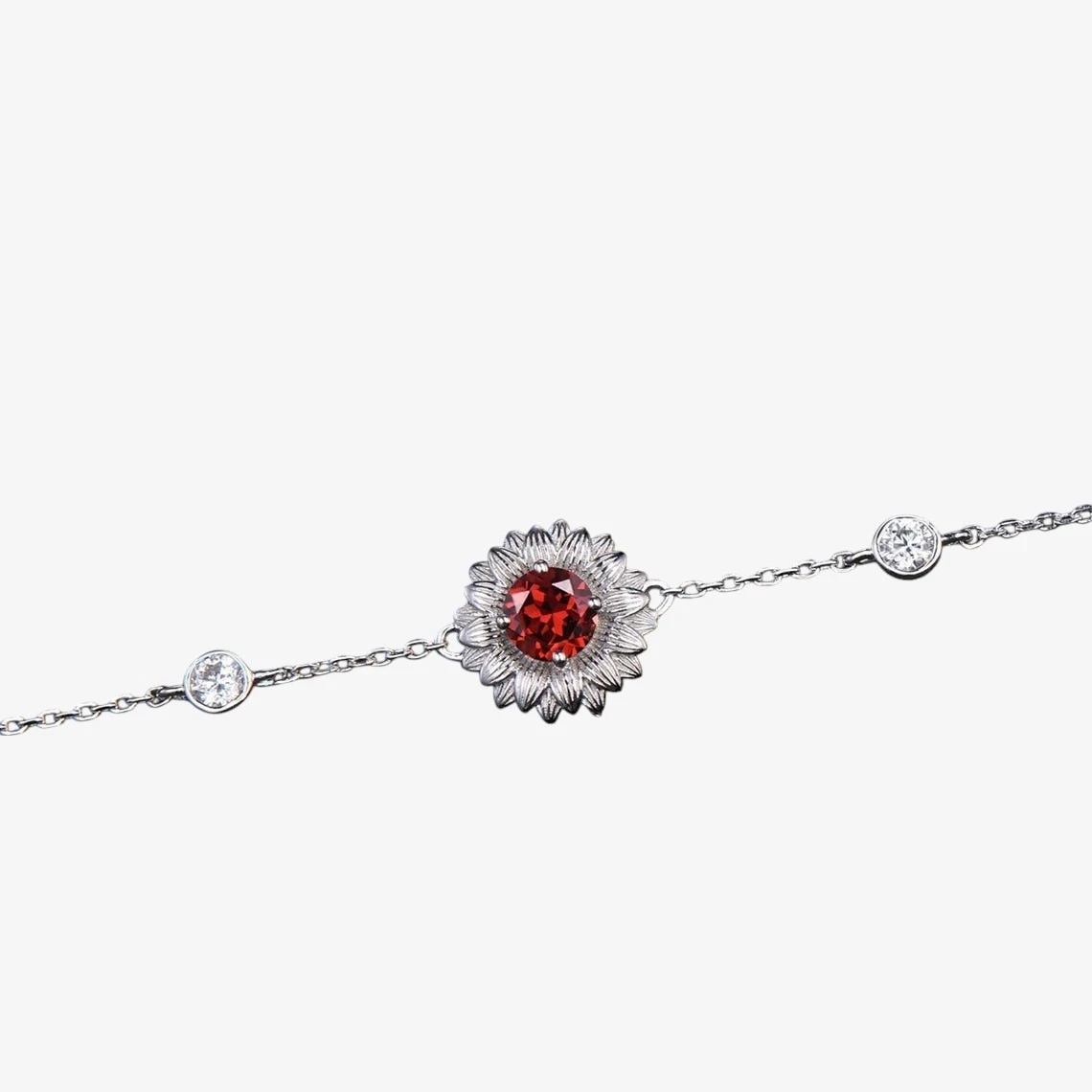 Add a touch of vintage charm with this beautiful ruby sunflower bracelet. It features three round-cut rubies set in a delicate floral design. The style is elegant yet easy to wear every day. Perfect as a gift or to add a unique piece to your own collection. Classic, pretty, and full of warm color.